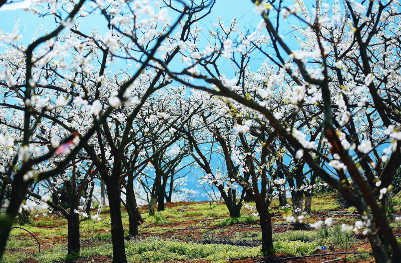 绽放的李花宛如春雪般洒满山头。(卢先庆 摄)