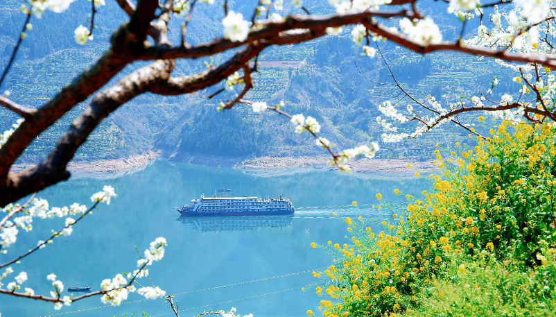 航行途中,两岸青山如黛,漫山遍野的李花点缀其间,如云似雪,美不胜收,引得船上游客纷纷拍照留影。
